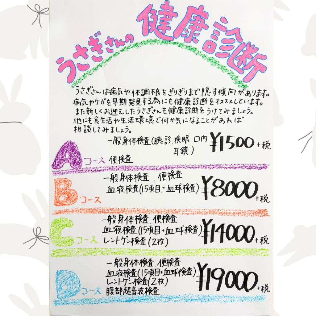 看護師が「うさぎの健康診断」ポスターを作成しました。院内でも掲示している内容で、健診の主な項目を分かりやすくまとめています。